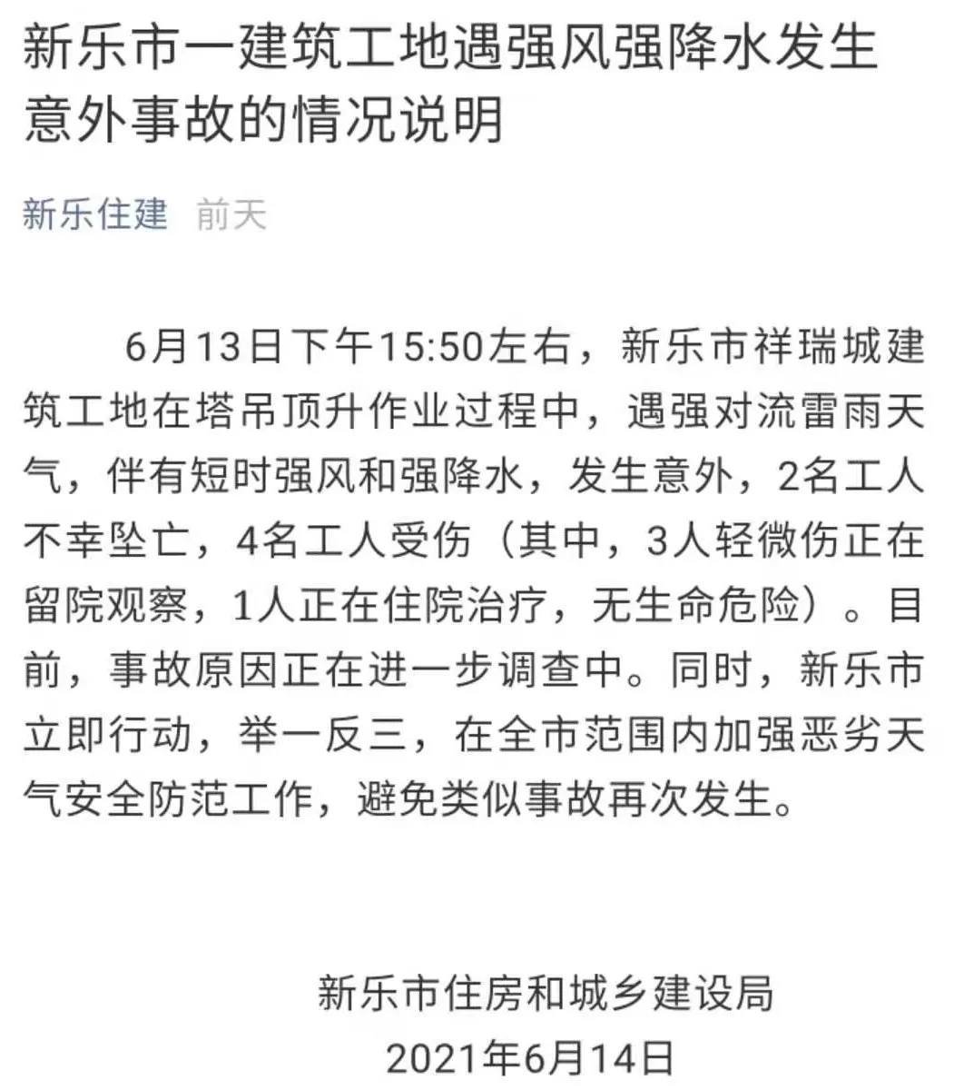 新樂住建消息,2021年6月13日下午15:50左右,石家莊新樂市祥瑞城建筑工地在塔吊頂升作業(yè)過程中,遇強(qiáng)對流雷雨天氣,2名工人不幸墜亡,4名工人受傷。目前,事故原因正在進(jìn)一步調(diào)查中。