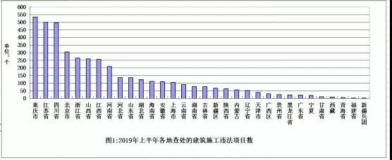 從各地查處的違法工程項(xiàng)目數(shù)量看,重慶、江蘇、四川3?。ㄊ校┎樘幜Χ容^大,分別查處項(xiàng)目535個(gè)、500個(gè)、496個(gè)(見圖1)。
